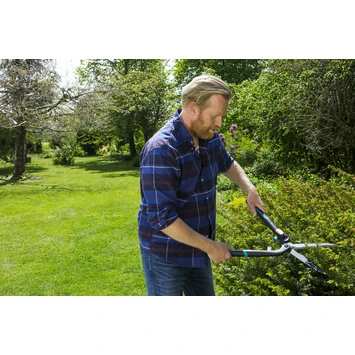 De 2-in-1 EnergyCut heggenschaar van Gardena maakt indruk met een tweedelige versnelling, modern design, uitstekende snijkracht, ergonomische vorm en laag gewicht. De stevige, gekartelde messen, de ergonomisch gevormde kunststoffen handgrepen en een perfecte werkhoek van 20° zorgen voor een bijzonder comfortabele houding tijdens het werken. De geïntegreerde trimmer maakt het mogelijk om dikkere takken eenvoudig te knippen. De geïntegreerde stopbuffers beschermen de polsen. Het handvatmateriaal is, net als alle andere elementen van de heggenschaar 2in1 EnergyCut, bijzonder stabiel en duurzaam. De totale lengte van de heggenschaar is 60 cm.