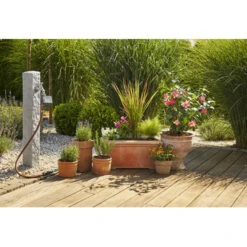 De Gardena Micro Drip startset bloempotten M met besproeiingscomputer bevat alle onderdelen die nodig zijn voor automatische en waterbesparende irrigatie van 7 bloempotten en 3 plantenbakken op balkons en patio’s. De drukreducende Master-unit is via de slang op de kraan aan te sluiten. De bloempotten worden nauwkeurig en individueel via het leidingsysteem bewaterd met behulp van druppelaars. Het systeem wordt automatisch aangestuurd via de GARDENA besproeiingscomputer Flex.